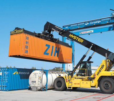 波兰东部边境的马拉舍维奇站是中欧班列的重要枢纽。图为8月29日,在马拉舍维奇铁路货运场站,工人正在进行集装箱吊装作业。本报记者 刘仲华摄