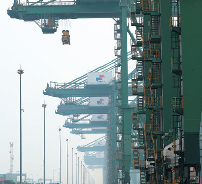 依托天津港的区位优势,海铁联运成为天津中欧班列的特色。图为9月18日,天津港集装箱岸桥作业现场。本报记者 何嘉豪摄