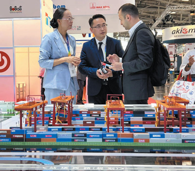 在2023年慕尼黑国际物流博览会上,工作人员在中铁集装箱运输有限公司展台前向国外客户介绍广州国际港中欧班列站点设施。本报记者 李 强摄