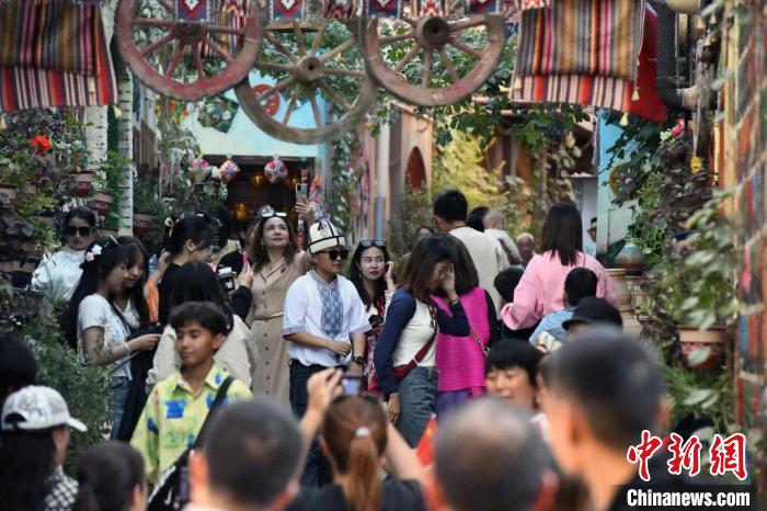 正值中秋国庆假期,位于中国西部的新疆喀什古城景区迎来旅游高峰,成为众多游客的出行目的地。图为10月1日,喀什古城景区里络绎不绝的游客。 中新网记者 孙亭文 摄