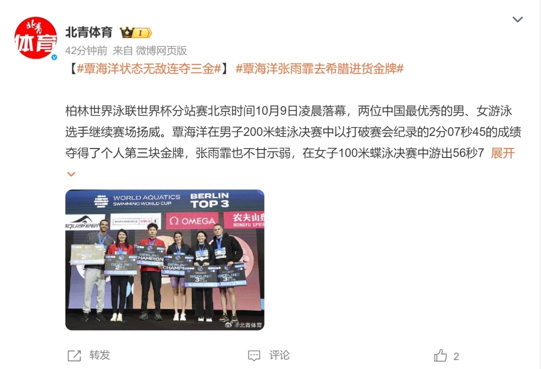 世界杯分站赛的下一站将于10月13日在雅典进行,覃海洋和张雨霏继续征战,粉丝们称这两位中国游泳队的金童玉女又将继续到希腊“进货”金牌。