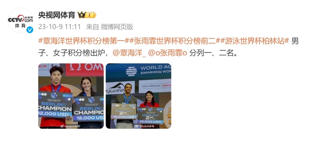 北京时间今天凌晨,柏林世界泳联世界杯分站赛落幕。覃海洋、张雨霏分别位列男子、女子积分榜的第一名和第二名。