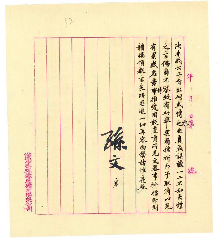 此电文拟于1912年10月14日,由近代中国乃至亚洲最大的钢铁煤联营公司——汉冶萍煤铁厂矿有限公司以孙中山的名义代拟。孙中山亲笔署“孙文”二字,现为湖北省档案馆珍藏的唯一一份孙中山真迹。