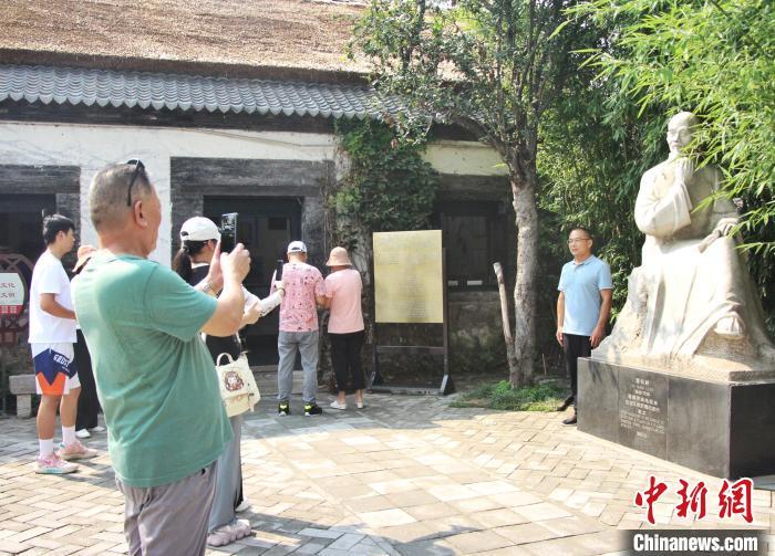 8月中旬,游客走进蒲松龄纪念馆,参观蒲松龄雕像。 中新社记者 赵晓 摄