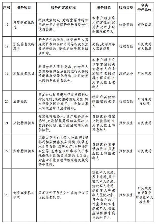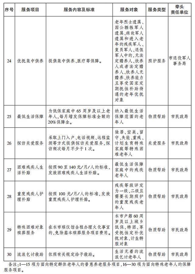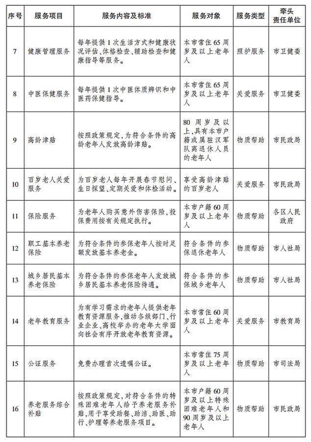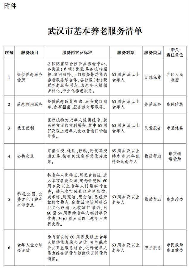 根据《方案》,武汉市制订了30项基本养老服务清单,对服务项目、服务内容及标准、服务对象、服务类型和牵头责任单位明确规定,加快建设覆盖全面、权责清晰、保障适度、可持续的基本养老服务体系,不断增强老年人获得感、幸福感、安全感。