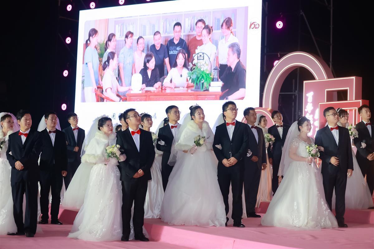30对新人互换戒指、深情拥吻。他们所在的科室送上《十月家书》,新人们为爱宣誓,并与“人民好声音”top5歌手共同合唱《明天会更好》,掌声、祝福声、欢呼声响起。通过庄严而又神圣的仪式,新人们彼此心心相印,许下携手一生的诺言。