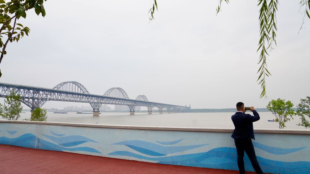 近日,游客在长江国家文化公园九江城区段内留影。新华社记者 胡晨欢 摄
