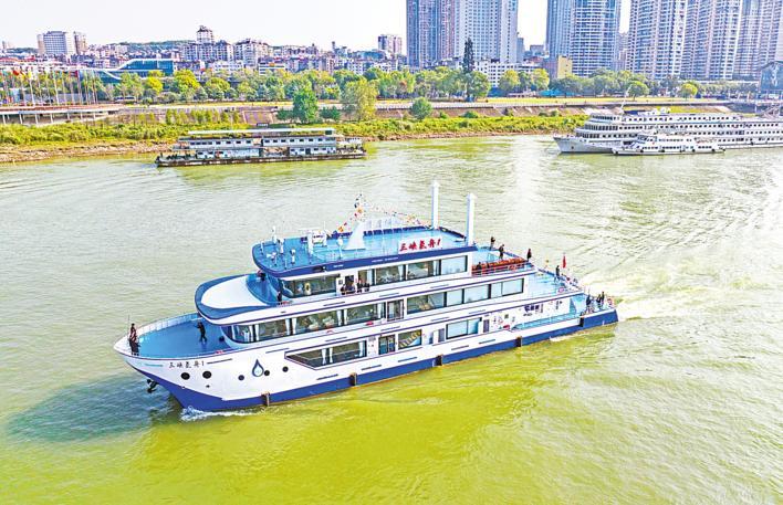 10月11日上午,氢燃料电池动力示范船“三峡氢舟1”号在宜昌三峡游客中心完成首航。(湖北日报全媒记者 刘曙松 摄)