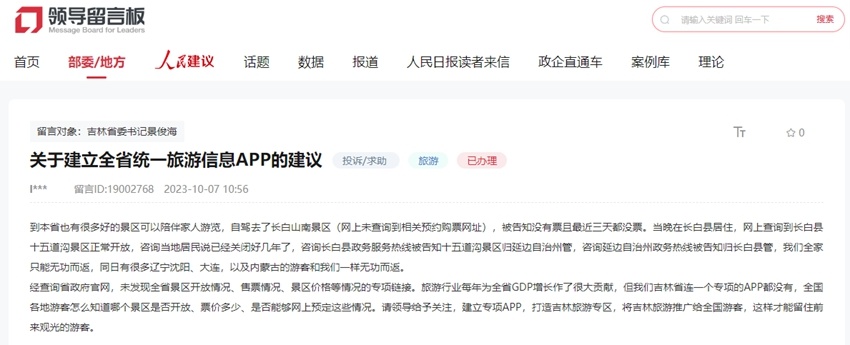 “旅游行业每年为全省GDP增长作了很大贡献,但我们吉林省连一个专项的APP都没有,全国各地游客怎么知道哪个景区是否开放、票价多少、是否能够网上预订这些情况。请领导给予关注,建立专项APP,打造吉林旅游专区,将吉林旅游推广给全国游客,这样才能留住前来观光的游客。”网友在留言中写道。