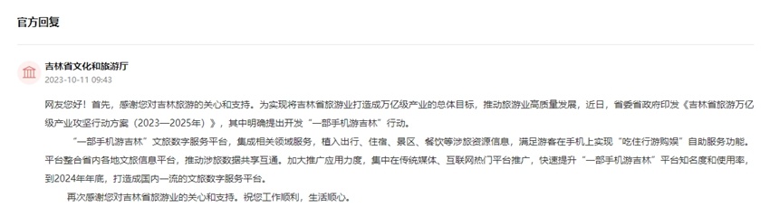收到留言后,吉林省文旅厅回复表示,为实现将吉林省旅游业打造成万亿级产业的总体目标,推动旅游业高质量发展,近日,吉林省委省政府印发《吉林省旅游万亿级产业攻坚行动方案(2023—2025年)》,其中明确提出开发“一部手机游吉林”文旅数字服务平台的行动。这与网友的建议不谋而合。