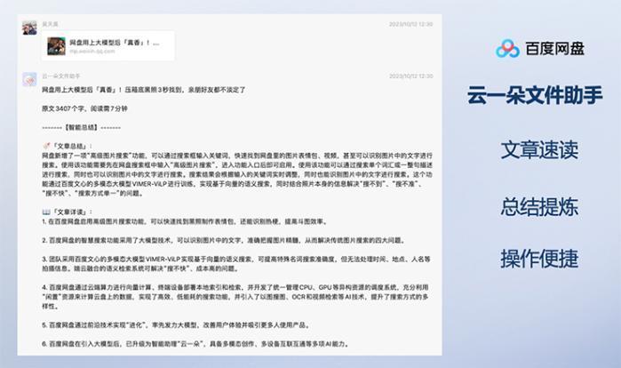 近期,百度网盘还推出了微信端可使用的“云一朵文件助手”,转发任意公众号文章给云一朵,它就能直接“阅读”,并且在10秒内总结、提炼要点,让用户在短时间内获取“精华干货”。