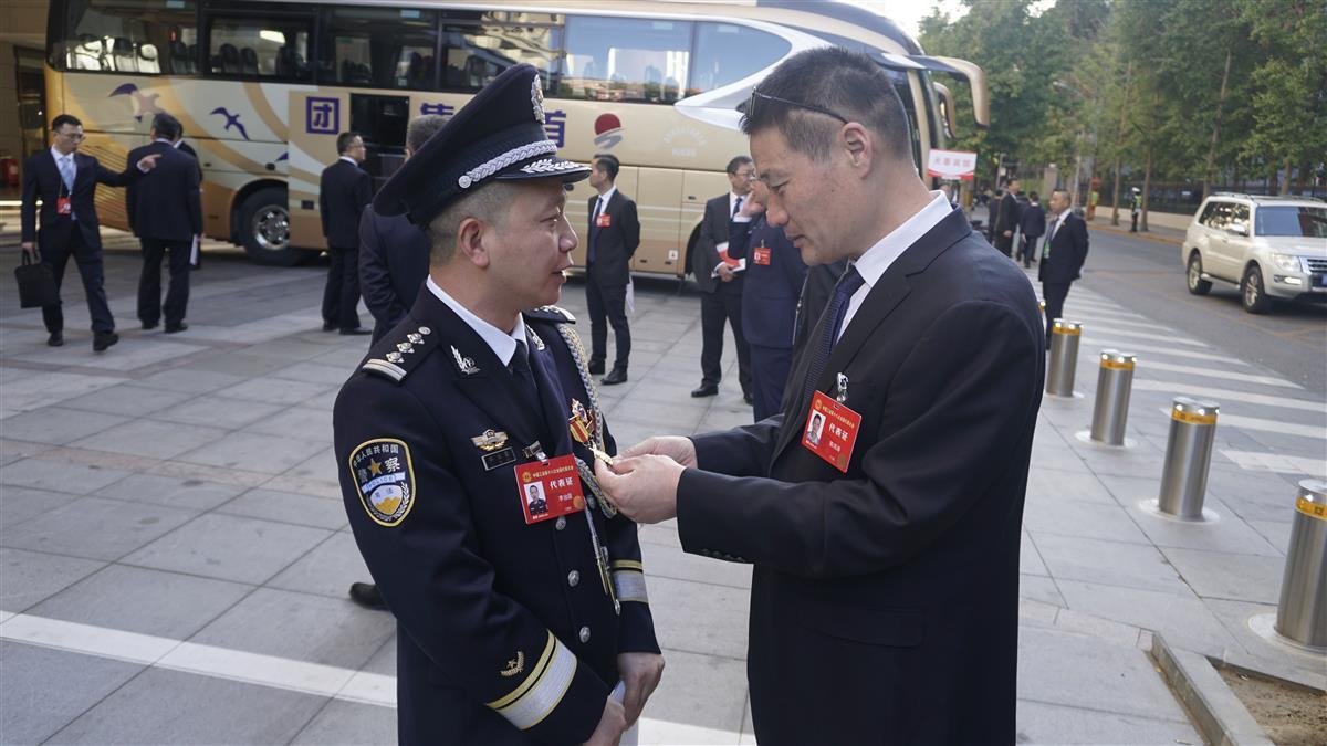 10月9日上午,在湖北省代表团准备登车前往人民大会堂参加开幕式时,中国工会十八大代表、湖北省直机关工会主任陈海涛(图右)观看中国工会十八大代表、湖北五一劳动奖章获得者、湖北省襄南监狱八监区一级警长李治国的奖章