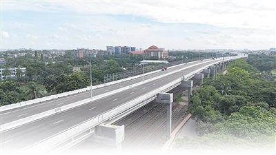 由中国山东高速集团主导投资建设运营的孟加拉国首条高架快速路——达卡机场高架快速路项目(一期)通车仪式9月2日在孟加拉国首都达卡举行。项目通车后极大改善了达卡市区交通状况。图为孟加拉国达卡机场高架快速路项目(一期)远景。本报记者 孙广勇摄