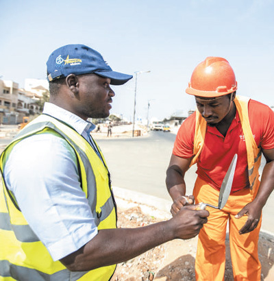 塞内加尔达喀尔快速公交项目是塞内加尔第一条城市快速公交线路。这条长约18公里的道路将穿过达喀尔人口密度最高的社区和核心商务区,建成后有助于缓解首都交通压力。图为当地员工在项目建设工地交流。新华社记者 李亚辉摄