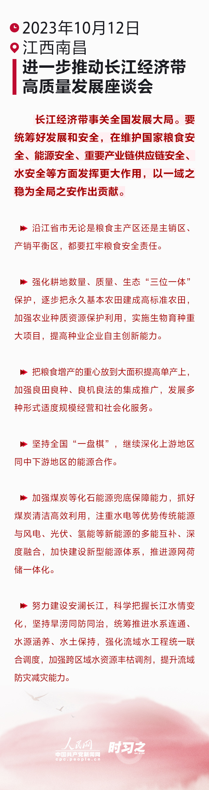长江经济带事关全国发展大局。统筹好发展和安全,是习近平总书记“时时放心不下”的大事。党的十八大以来,习近平总书记先后四次主持召开座谈会,对进一步推动长江经济带高质量发展作出谋划部署,谋长远之势、行长久之策、建久安之基。