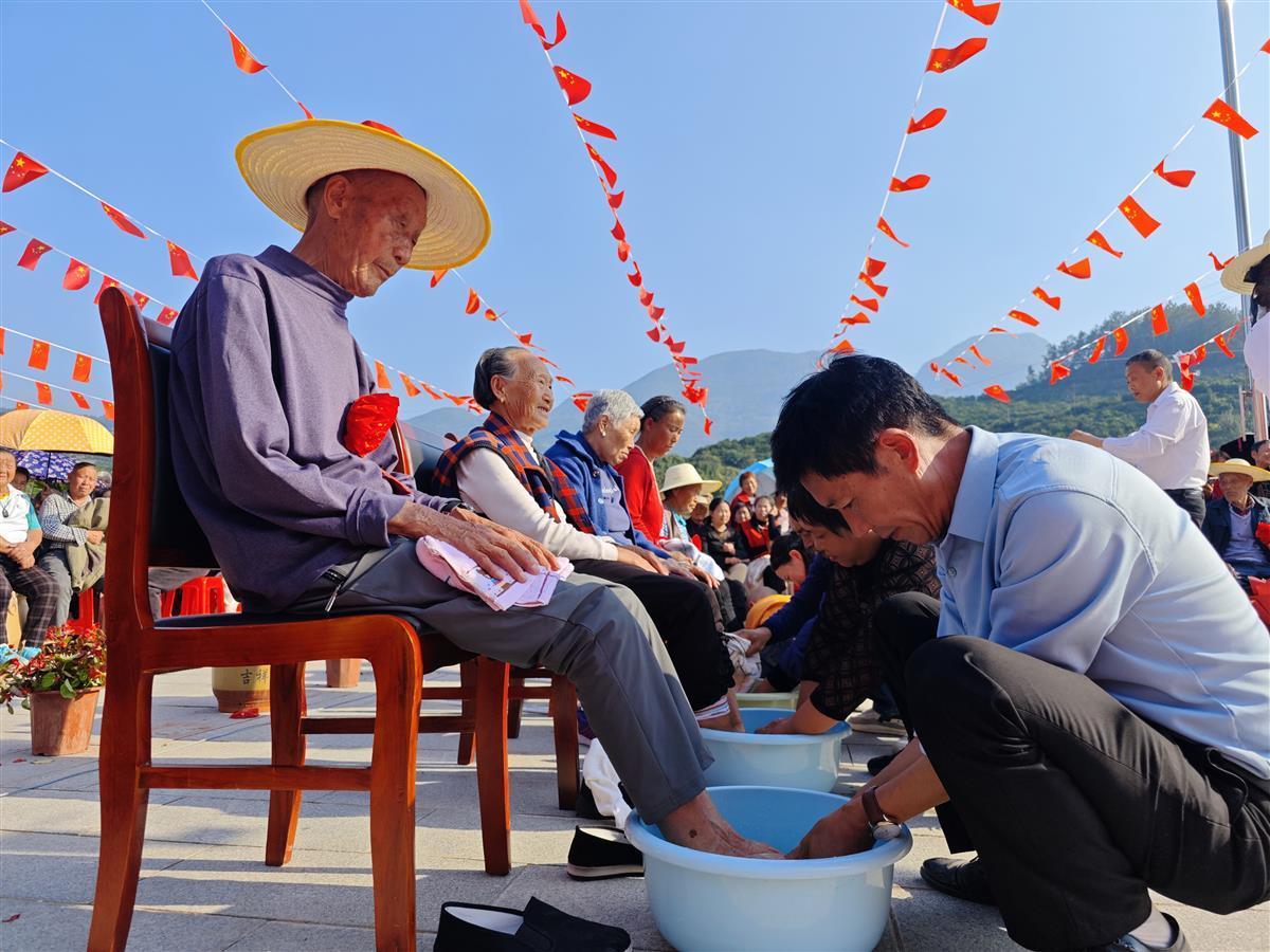 下午,老人们在广场互动《击鼓传花》,传递出彼此的幸福与喜悦,舞台上你一首《九九女儿红》,我一曲《九子鞭》,展现“夕阳无限好”的生命魅力。年长者不仅是儿女们的幸福,更是属于整个社会的财富。《当父母老了》节目中,儿女在为父母洗脚的场景打动人心。老人刘明龙的女婿谭明俭说:“今天帮父亲洗脚的时候他特别开心,希望他老人家能一直快乐。”