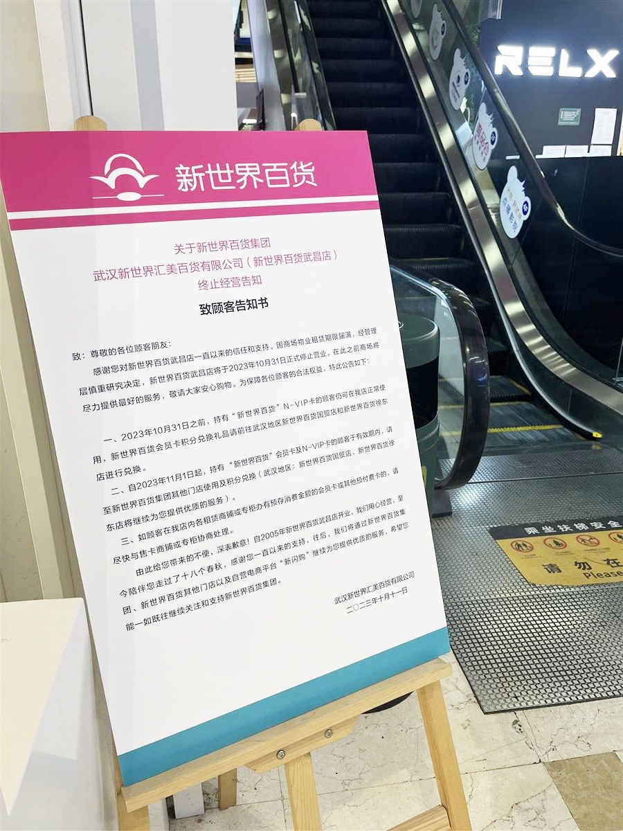 张贴在商场门口的《致顾客告知书》显示,因商场物业租赁期限届满,经管理层慎重研究决定,新世界百货武昌店将于2023年10月31日正式停止营业。2023年10月31日之前,持有“新世界百货”N-VIP卡的顾客仍可在店内正常使用,新世界百货会员卡积分兑换礼品请前往武汉地区新世界百货国贸店和新世界百货徐东店进行兑换。自2023年11月1日起,持有“新世界百货”会员卡及N-VIP卡的顾客于有效期内,请至新世界百货集团其他门店使用及积分兑换。如顾客在店内各租赁商铺或专柜办有预存消费金额的会员卡或其他预付费卡的,请尽快与售卡商铺或专柜协商处理。