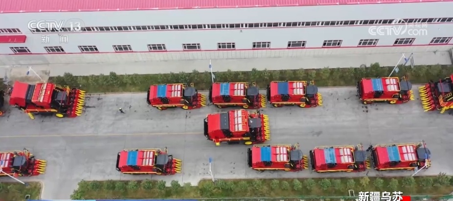 在新疆乌苏,这家国产智能采摘打包机的工厂,记者见到数十台机器整装待发,即将走出国门。