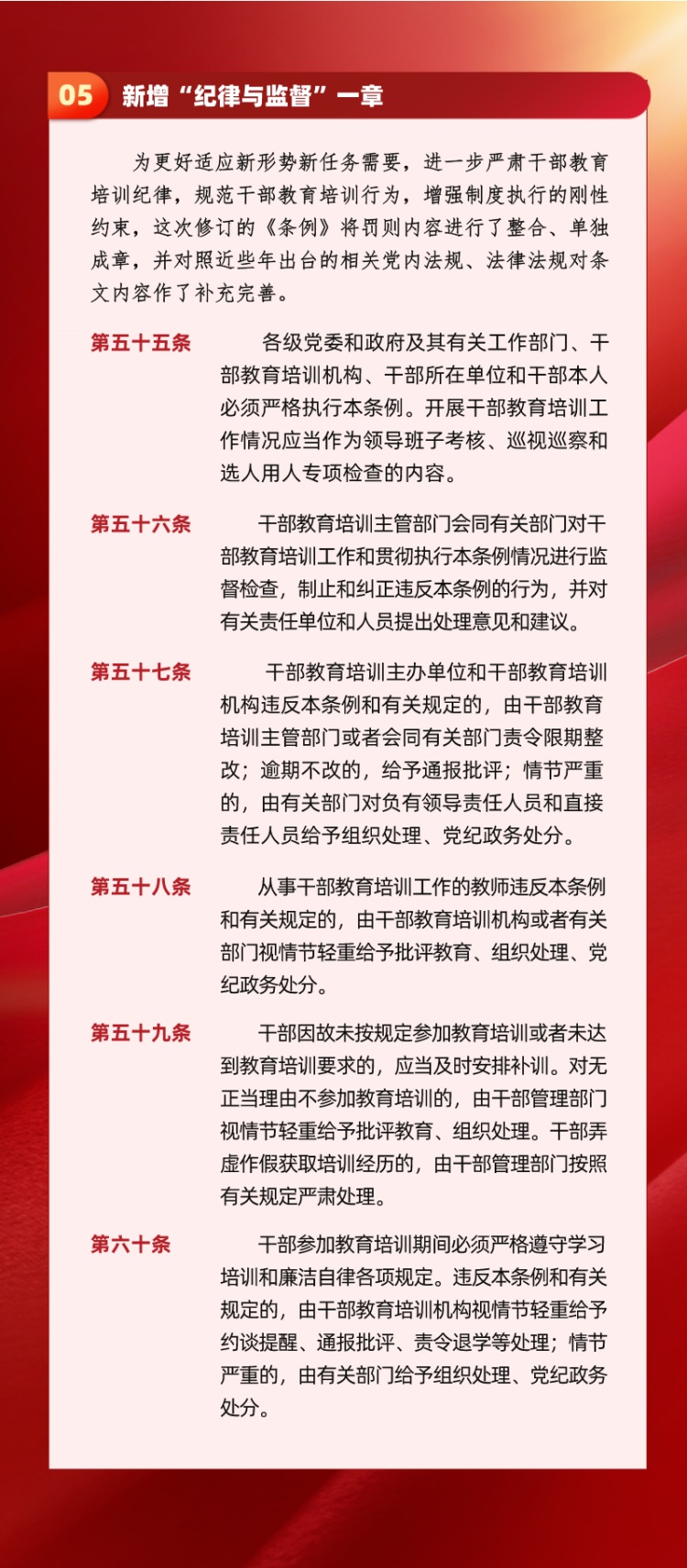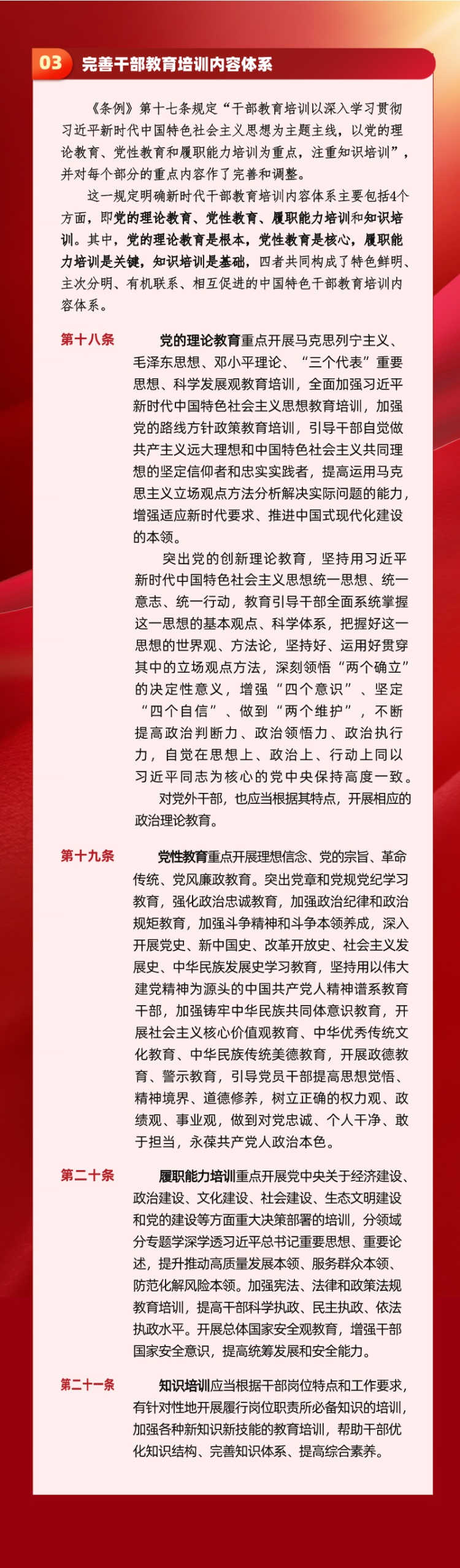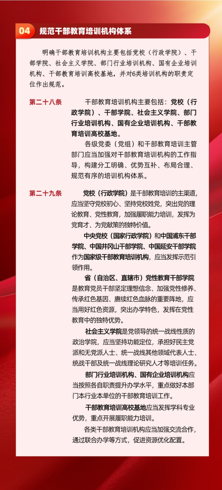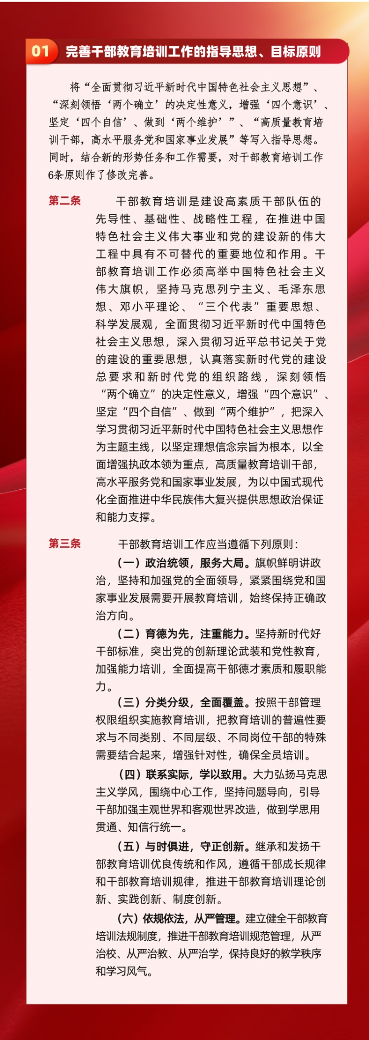 干部教育培训是建设高素质干部队伍的先导性、基础性、战略性工程,在推进中国特色社会主义伟大事业和党的建设新的伟大工程中具有不可替代的重要地位和作用。为了推进干部教育培训工作科学化、制度化、规范化,培养造就政治过硬、适应新时代要求、具备领导社会主义现代化建设能力的高素质干部队伍,近日中共中央印发了修订后的《干部教育培训工作条例》(以下简称《条例》)。