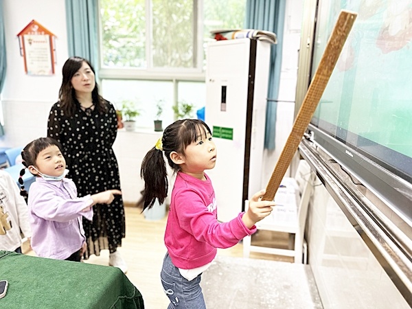 在大兴路小学,江豚是学生们学习的好伙伴。学生张亦萱说,学习数学知识时,她需要运用数学知识帮江豚统计收到了多少份礼物,午饭时,她和同学们需要帮江豚辨别食物的种类,江豚还会教他们学习生态环保知识……
