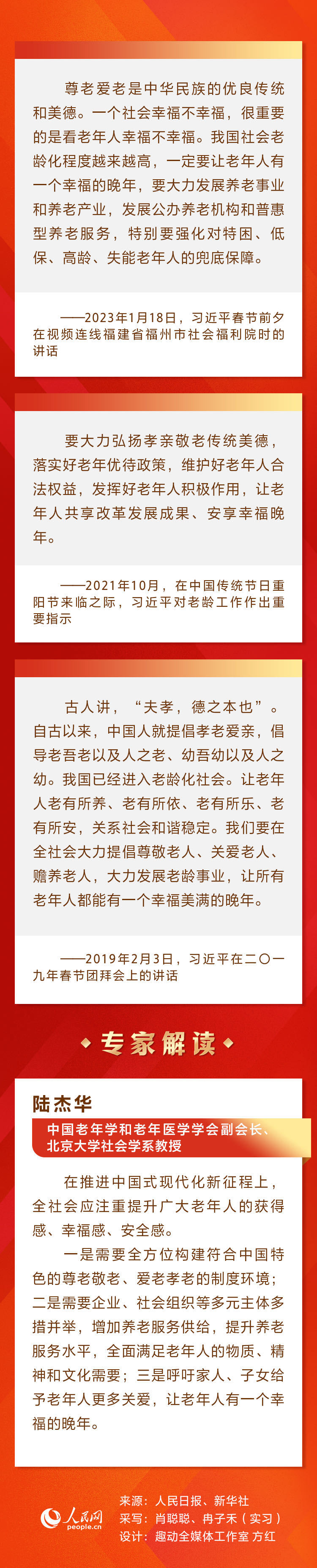 党的十八大以来,习近平总书记作出一系列高瞻远瞩的重要指示,规划部署国家老龄事业发展和养老体系建设。人民网带您重温习近平总书记重要论述并邀请专家解读。