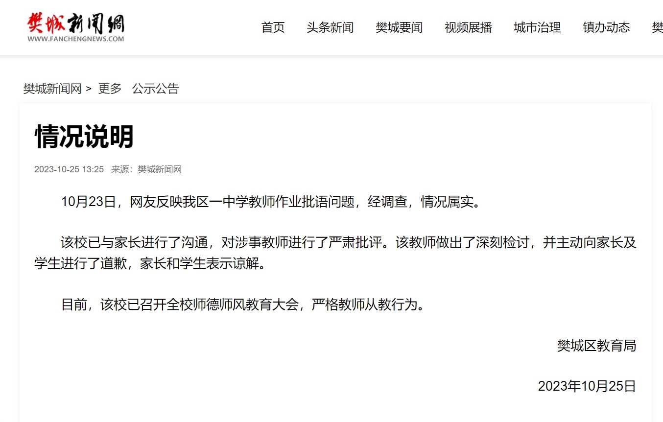 10月25日13时25分,樊城新闻网发布樊城区教育局的情况说明,原文如下:“10月23日,网友反映我区一中学教师作业批语问题,经调查,情况属实。该校已与家长进行了沟通,对涉事教师进行了严肃批评。该教师做出了深刻检讨,并主动向家长及学生进行了道歉,家长和学生表示谅解。目前,该校已召开全校师德师风教育大会,严格教师从教行为。”