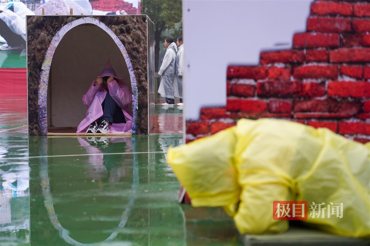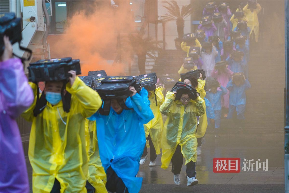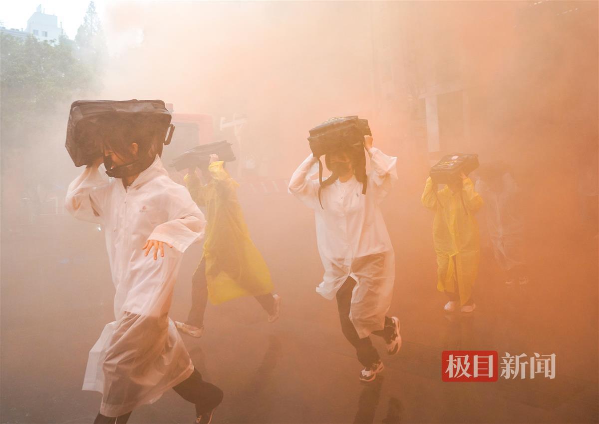 极目新闻记者来到了武汉二中广雅中学。该校的演练在细雨中进行。下午3时59分,该校教学楼前出现团团褐色烟雾。演练按照预先警报演练、空袭警报演练、解除警报演练、救援与防化演练四个步骤开展进行。下午4时,校园里准时响起了防空警报。首先响起的是预先警报,这意味着敌人即将进行空袭,提醒大家应快速进入人防工程或实行紧急疏散。记者看到,学生们戴着面罩或掩住口鼻,携带人防应急包,有序地从教学楼内跑出来进入人防工程内。15分钟后,空袭警报响起,表明敌人空袭临近城市,警告居民迅速紧急疏散掩蔽。来不及进入人防工程的居民利用地形地物就近隐蔽。演练场上,有的学生躲在模拟的墙角,有的学生抱头蹲坐在模拟的假山或洞窟内。下午4时27分许,响起了解除警报的声音,大伙在老师的带领下有序地离开。演练过程中,同学们还自己动手学习如何利用日常生活工具,快速制作简易担架的操作方法。