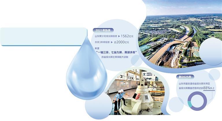 在6月份举办的山东省级水网先导区建设项目推进会上,现场签约12个项目,投资金额高达249亿元,多路资金相继涌入,山东水利建设马力十足。“2021年以来,山东累计完成水利投资1562亿元,未来3年还将投资近2000亿元,构建‘一轴三环、七纵九横、两湖多库’的省级水网主骨架和大动脉。”山东省水利厅发展规划处处长刘建基介绍,“到2025年,山东将基本建成省级水网先导区,省级水网覆盖范围将达到88%以上。”