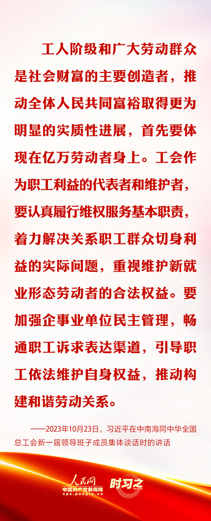 2023年10月23日下午,习近平总书记在中南海同中华全国总工会新一届领导班子成员集体谈话并发表重要讲话。他强调,工会作为职工利益的代表者和维护者,要认真履行维权服务基本职责,着力解决关系职工群众切身利益的实际问题,重视维护新就业形态劳动者的合法权益。