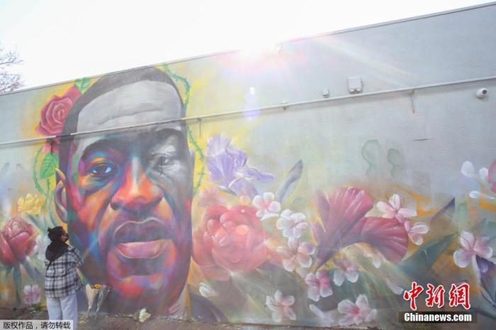 当地时间2020年5月,白人警察肖万在拘捕非裔男子弗洛伊德时,跪颈达9分钟导致弗洛伊德死亡。弗洛伊德濒死呼救称“我无法呼吸”的视频在全美引发大规模抗议。图为科罗拉多州丹佛市,一名女子在弗洛伊德的壁画前表达敬意。