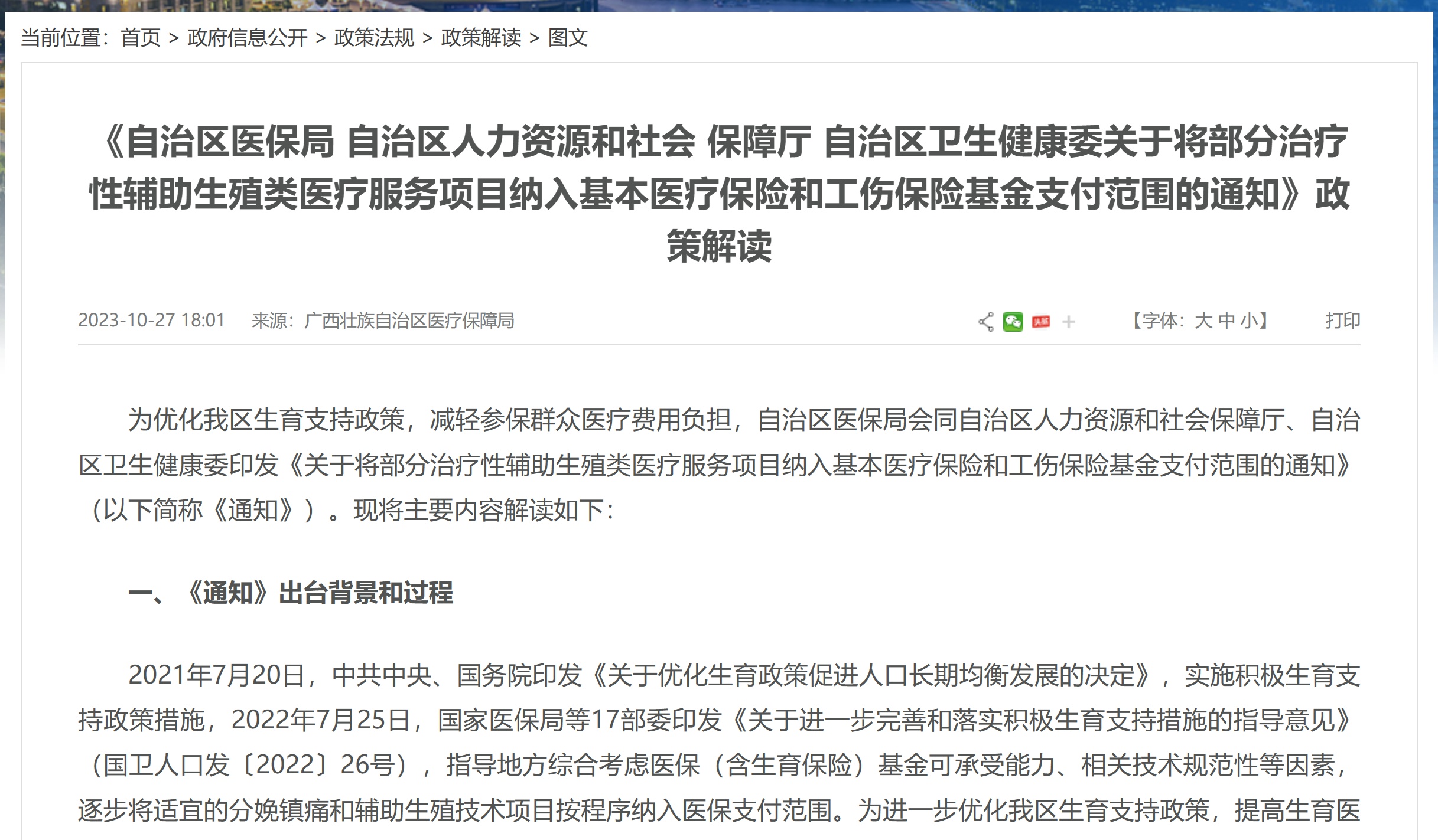 10月,广西正式发布《自治区医保局 自治区人力资源和社会保障厅 自治区卫生健康委关于将部分治疗性辅助生殖类医疗服务项目纳入基本医疗保险和工伤保险基金支付范围的通知》。