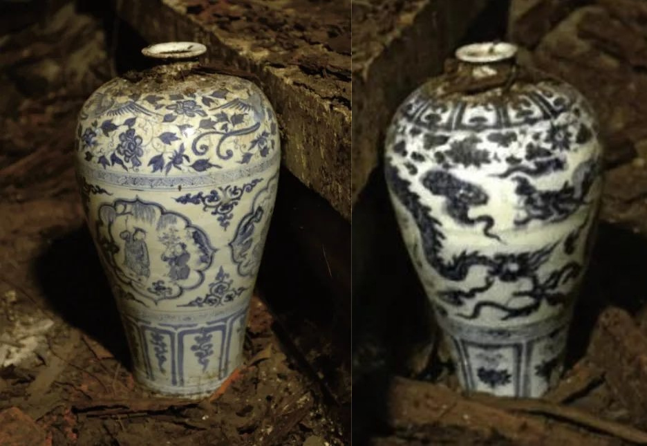 △两件梅瓶在郢靖王墓中出土时的情景。(左为四爱图梅瓶,右为青花龙纹梅瓶)