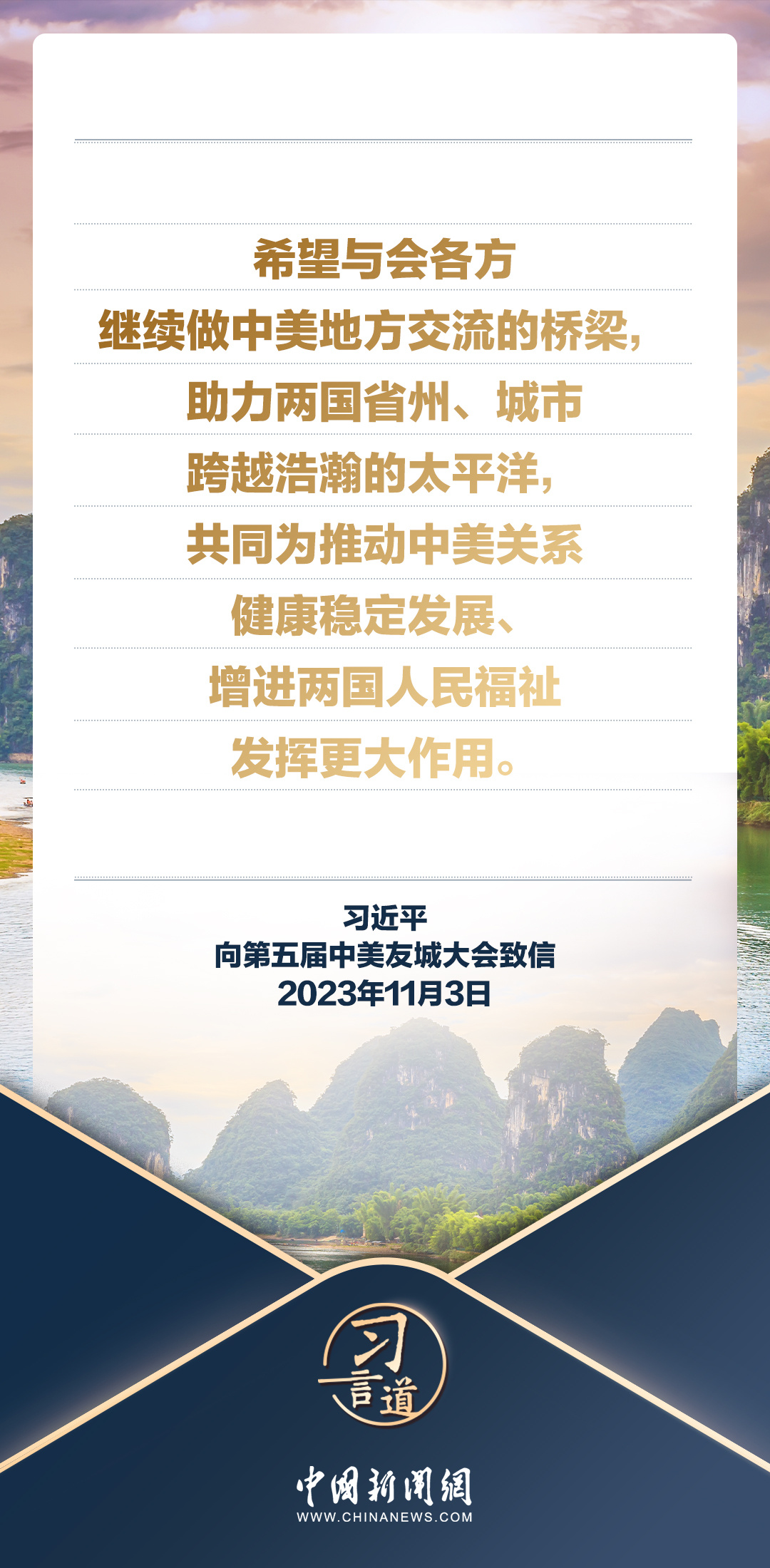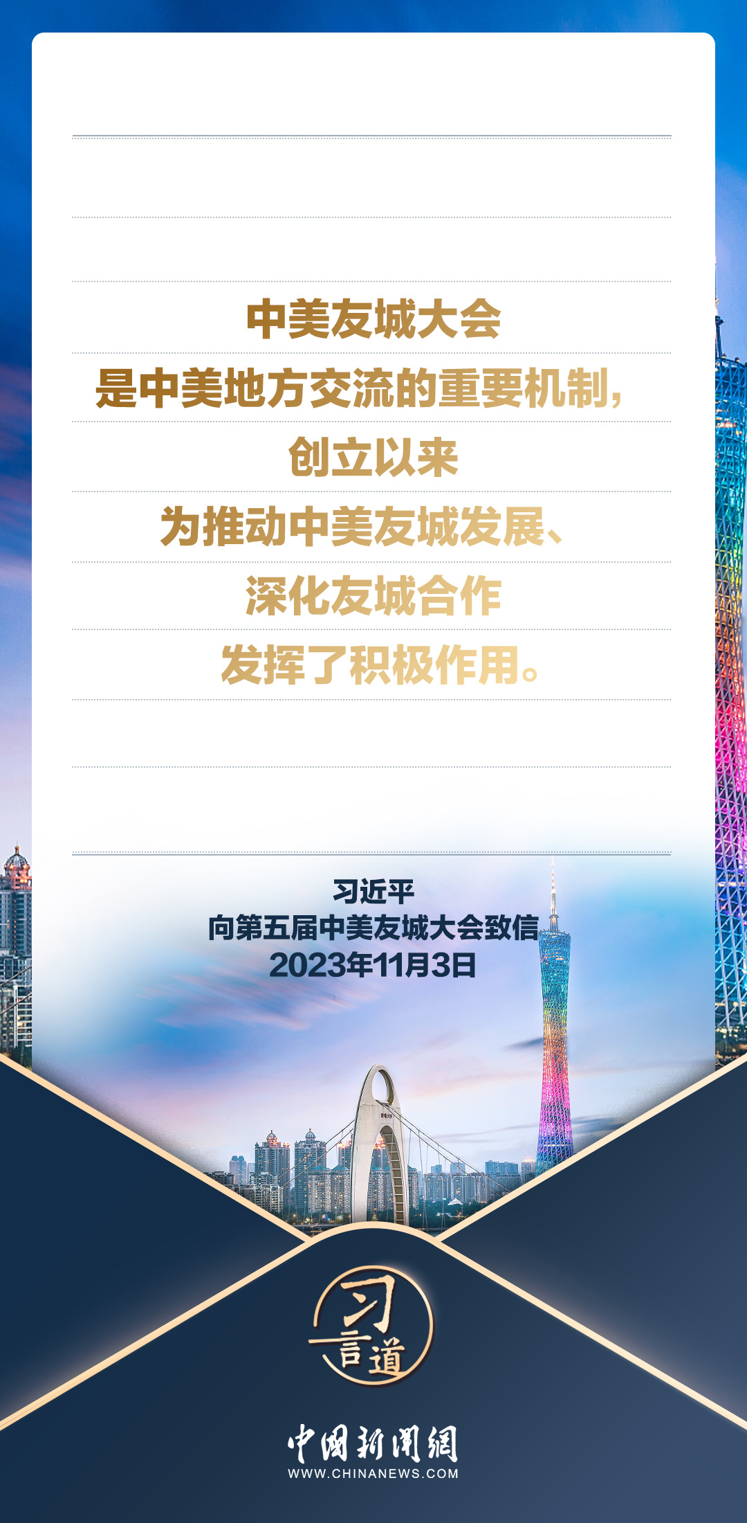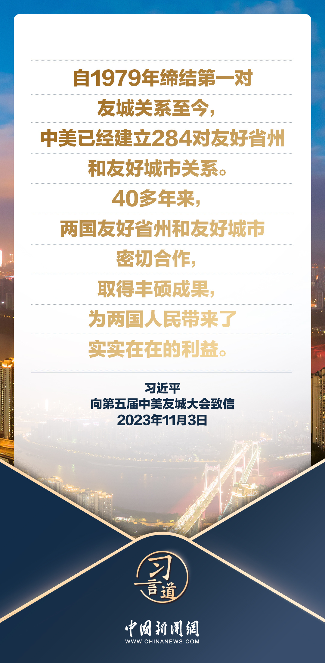 11月3日,国家主席习近平向第五届中美友城大会致信。习近平指出——