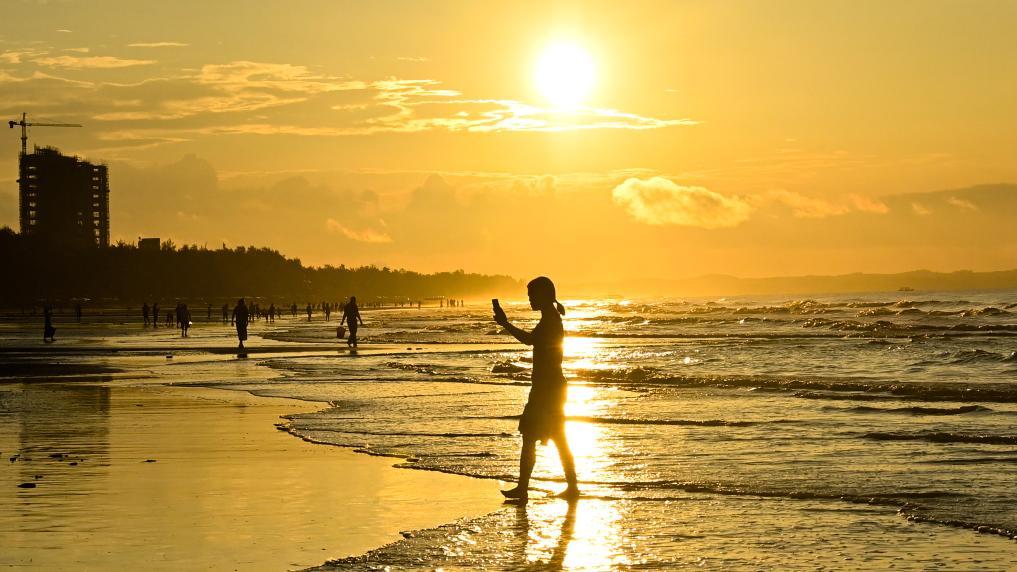 这是游客在防城港东兴市金滩上欣赏日出时的朝霞。新华社记者 张爱林 摄