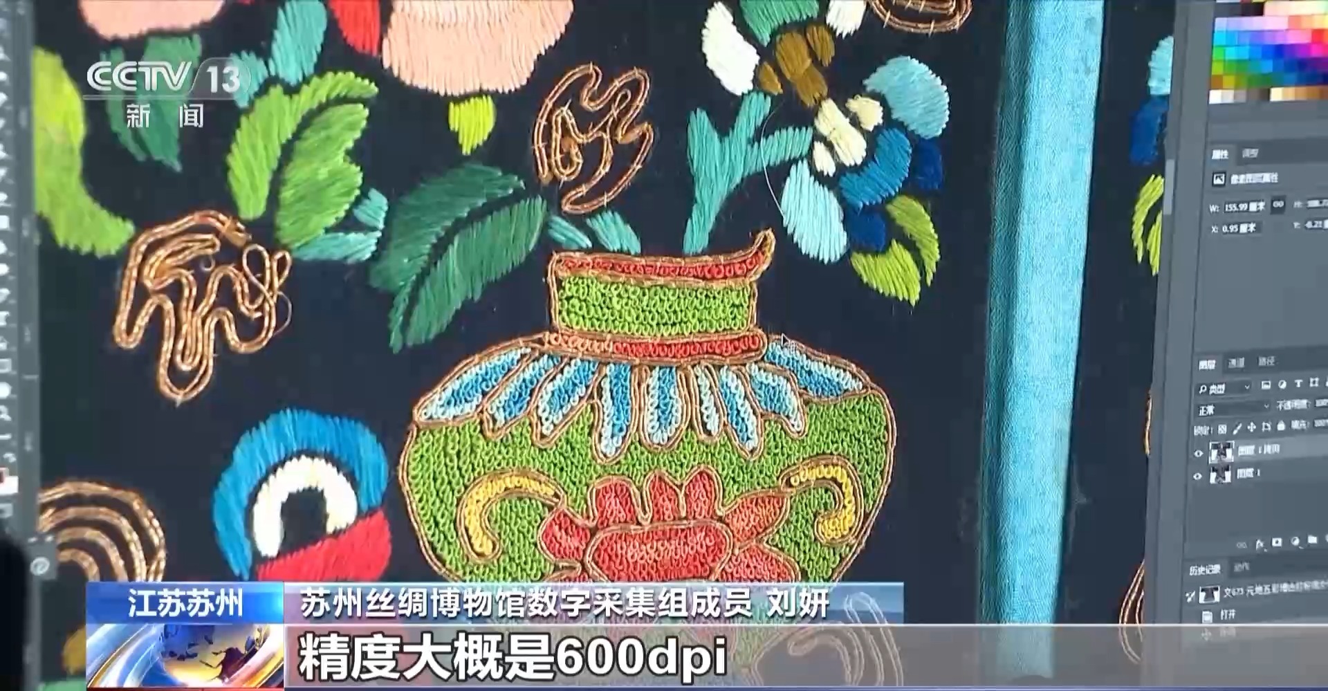 苏州丝绸博物馆数字采集组成员 刘妍:精度大概是600dpi,一张文件是1G以上,是国际通用的文物扫描标准。