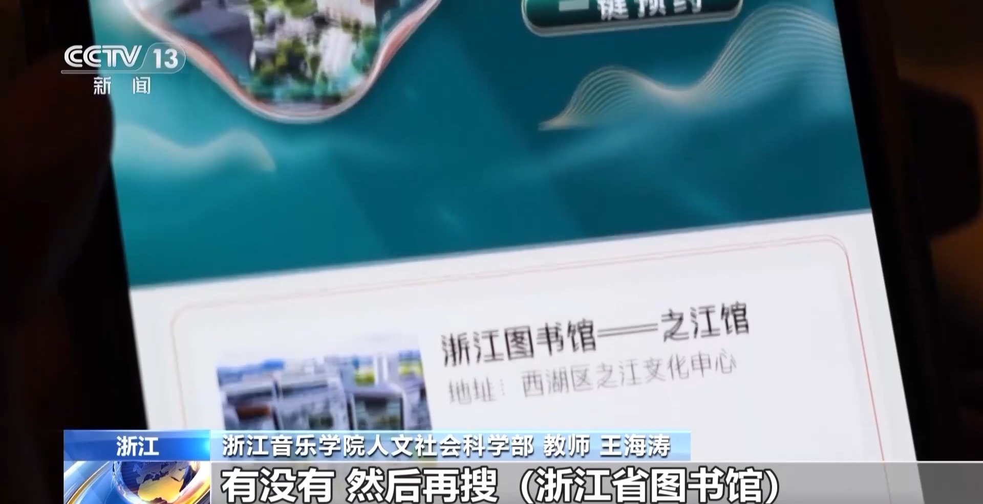 浙江音乐学院人文社会科学部教师 王海涛:以前找书我先搜一下杭州图书馆有没有,然后再去浙江省图书馆搜索,现在有了这个,只要一搜,它就会显示出来哪个图书馆有。
