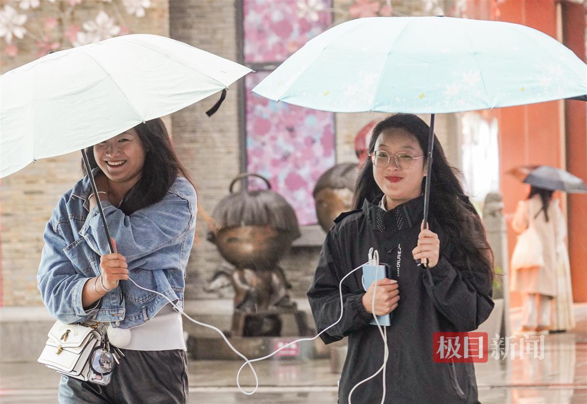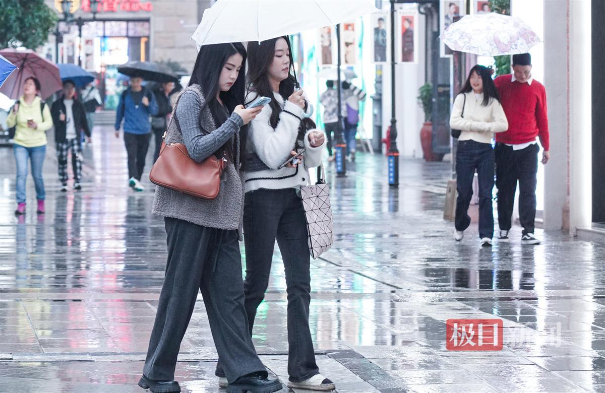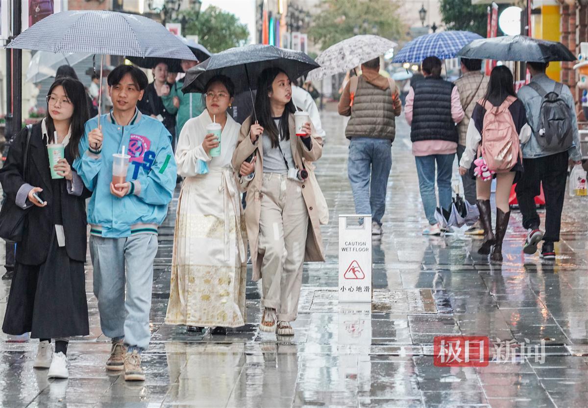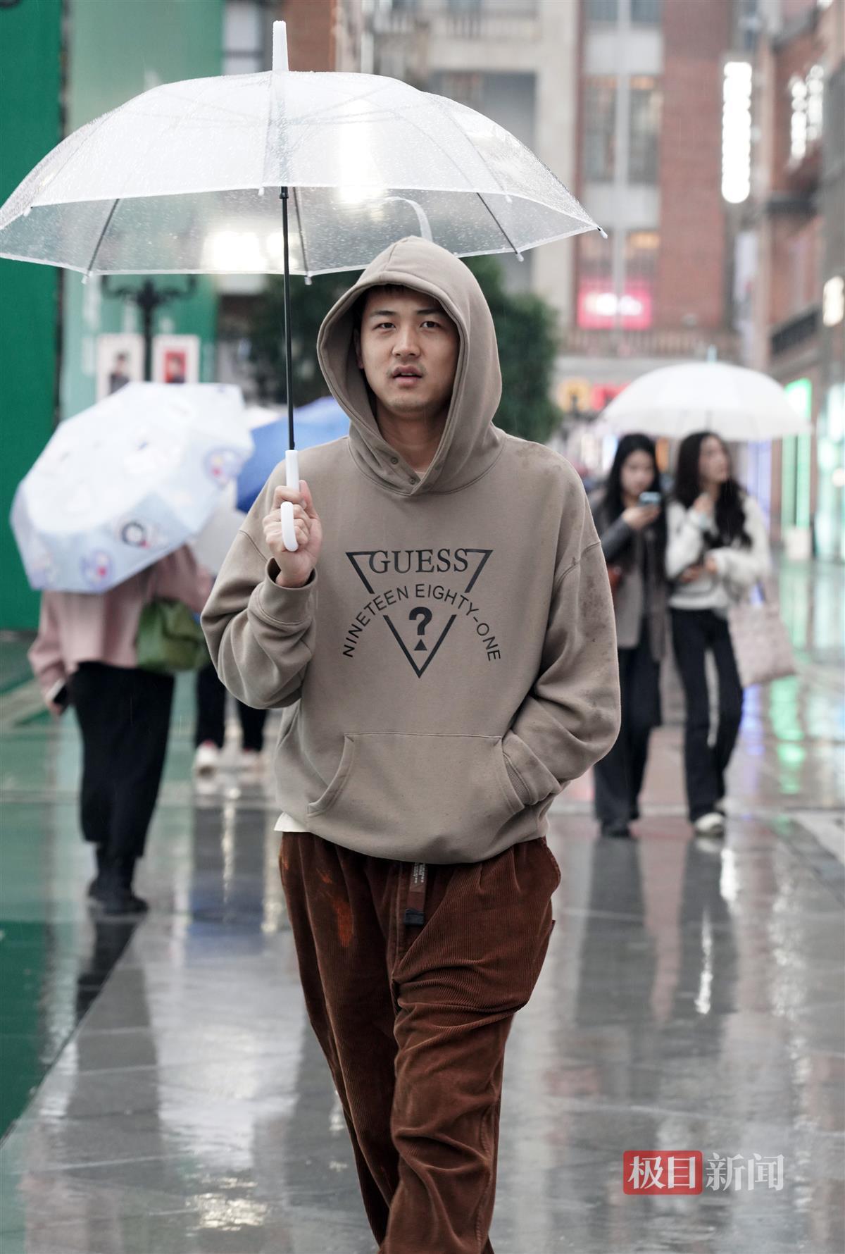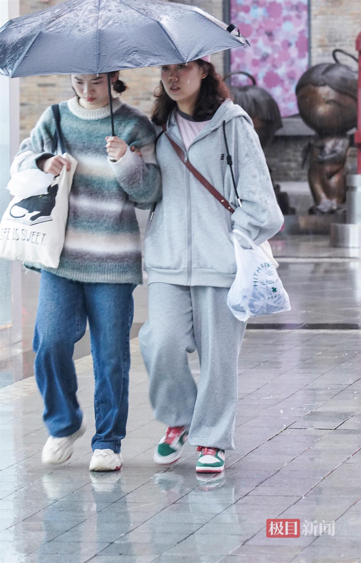 连日来,武汉天气断崖式切变:周五,艳阳高照,人们穿着短袖、躲着阳光行走;周六,阴雨来袭,人们忙着添衣;今日周日,更是风雨交加,人们穿着厚衣,还是感觉冷冷的。当日,在武汉楚河汉街上的行人已注意了保暖。