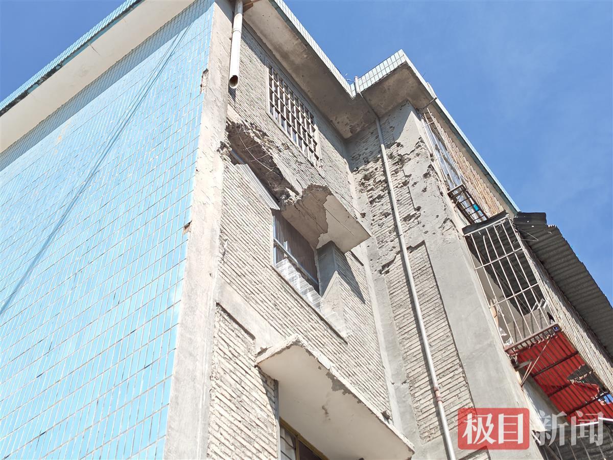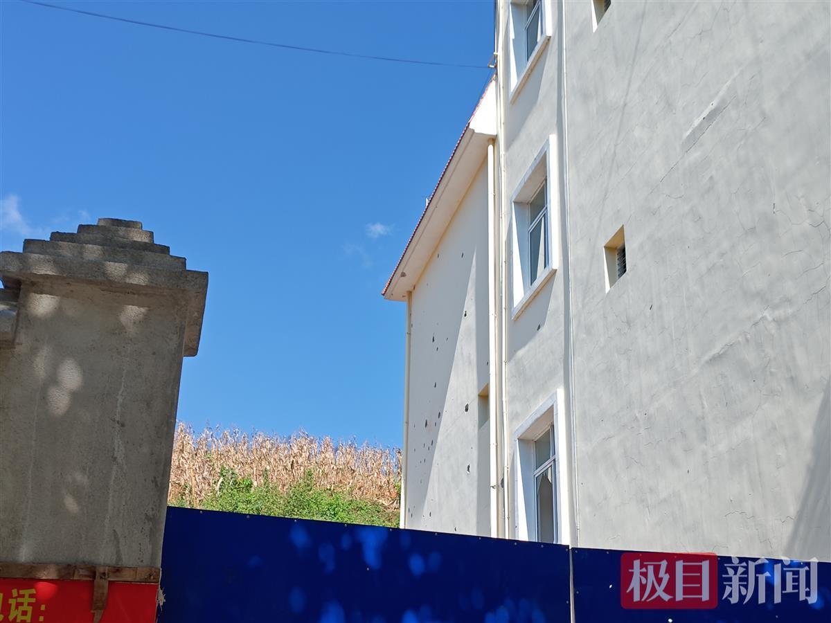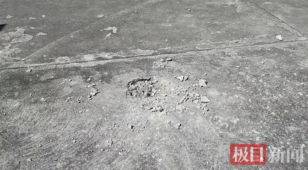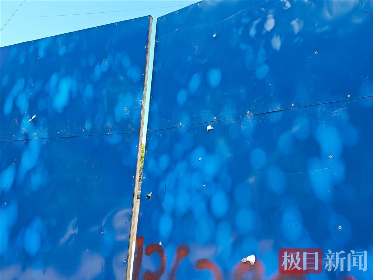 秦英告诉极目新闻记者,炮弹虽然没有造成人员伤亡,但周边居民家的损失也不小。秦英指着废品站的蓝色大铁门说,铁门上的缺口都是炮弹爆炸后,飞溅的弹片留下的痕迹。记者在现场看到,两扇蓝色铁门上有一二十个大小不一的洞,小的如黄豆,大的直径达三四厘米。废品站的另一侧是一幢四层楼房,2楼和4楼的玻璃已被炸碎,原本平整的水泥墙面被炸出密密麻麻、深浅不一的坑。