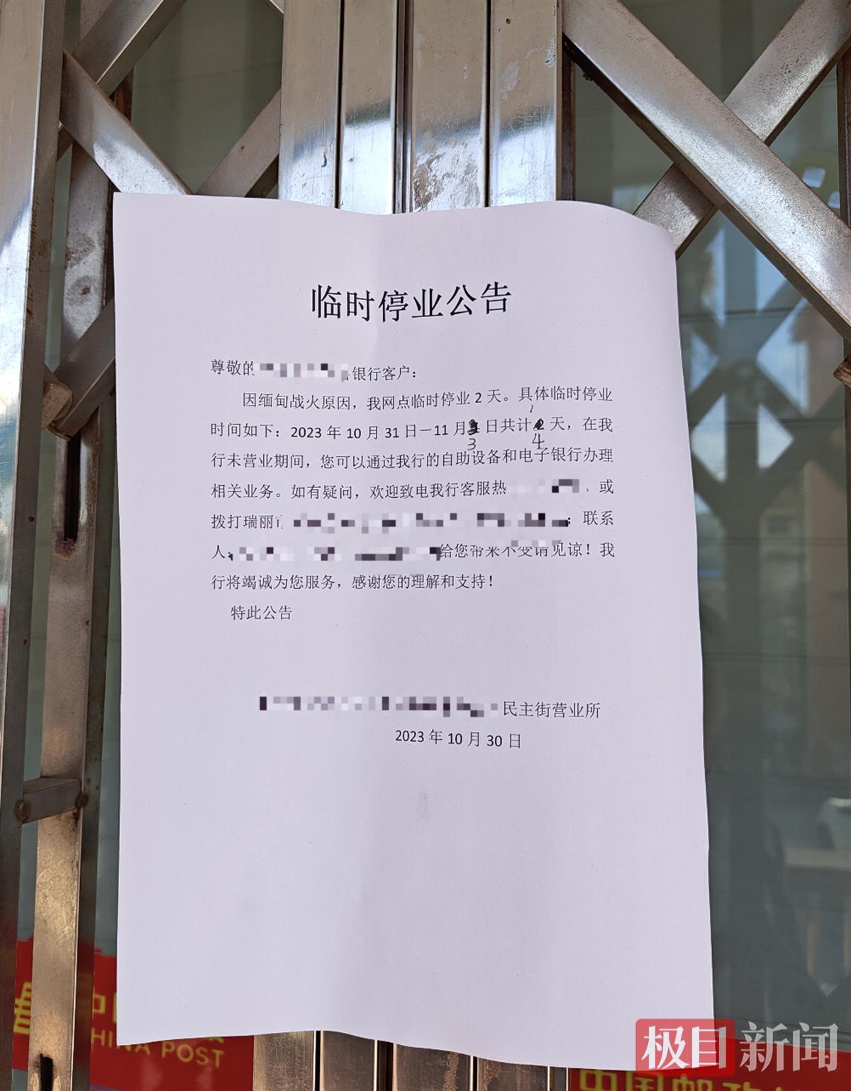 “近日,缅甸北部发生战事,波及德宏州瑞丽市畹町镇地区。根据当地政府暂不聚集的规定,经上级部门批准,该网点暂时不对外营业,具体恢复营业时间待定。”战事爆发一个多星期之后,11月5日,畹町镇的主街上较为冷清,不少营业场所和机构仍张贴着暂停营业的公告。镇内的几家加油站也已关闭,加油机四周围起了厚厚的沙袋。