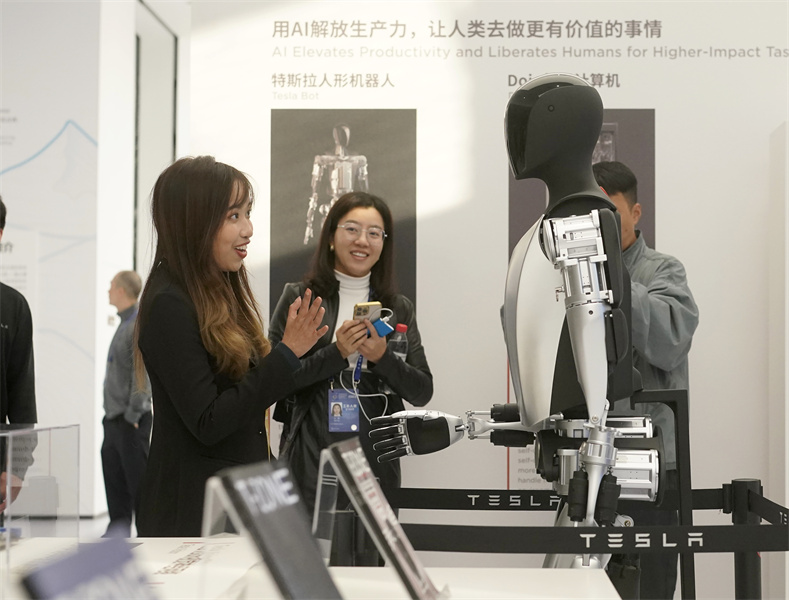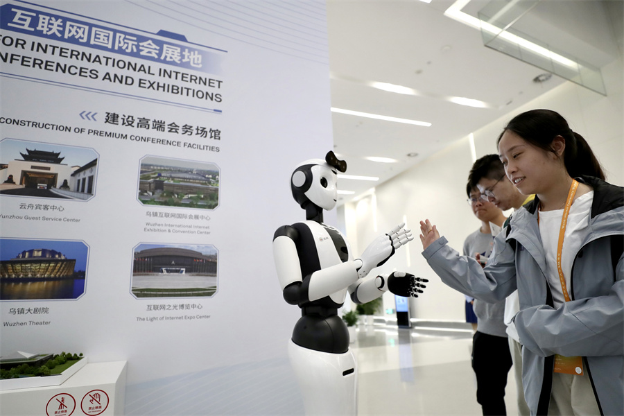 A woman interacts with a robot at the World Internet Science and Technology Museum in Wuzhen, Zhejiang province on Nov 7, 2023. [Photo by Gao Erqiang/China Daily]