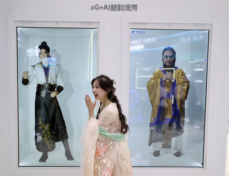 A woman is amazed by digital people at the Light of Internet Expo during the 2023 WIC Wuzhen Summit in Wuzhen, Zhejiang province on Nov 7, 2023. [Photo by Zhang Wei/China Daily]