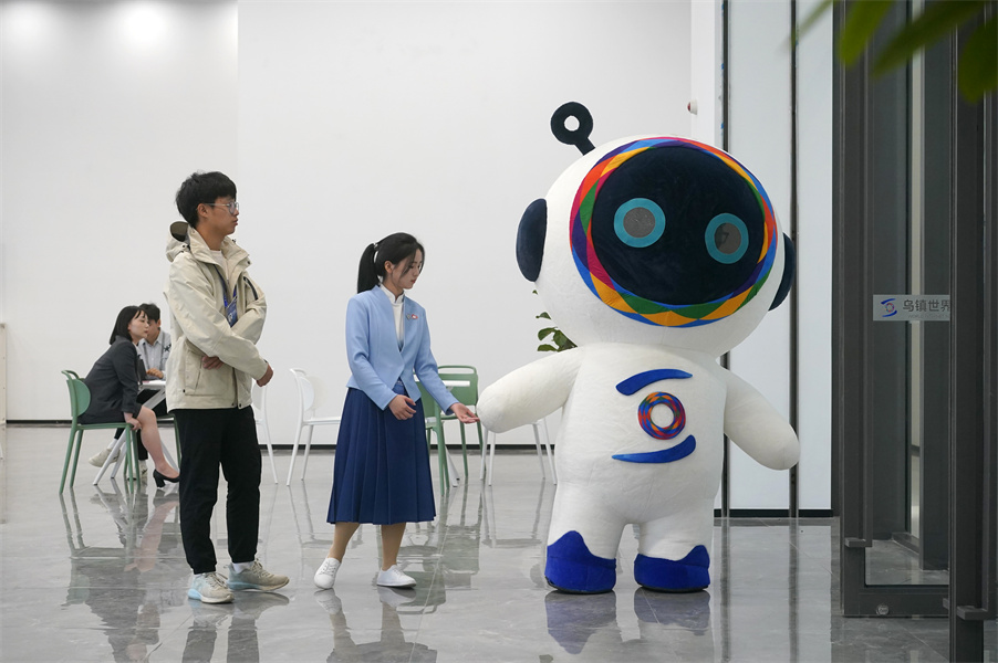 A mascot of the 2023 WIC Wuzhen Summit is seen at the World Internet Science and Technology Museum in Wuzhen, Zhejiang province on Nov 7, 2023. [Photo by Gao Erqiang/China Daily]
