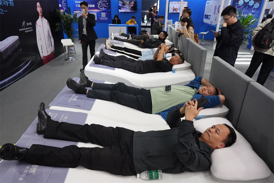 People experience smart beds at the Light of Internet Expo during the 2023 WIC Wuzhen Summit in Wuzhen, Zhejiang province on Nov 7, 2023. [Photo by Gao Erqiang/China Daily]