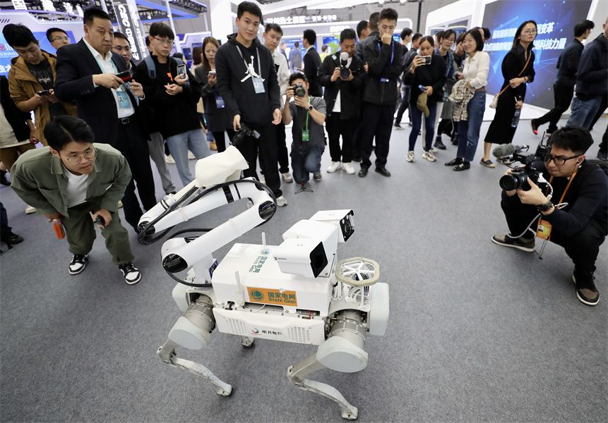 People take photos of a robot dog at the Light of Internet Expo during the 2023 WIC Wuzhen Summit in Wuzhen, Zhejiang province on Nov 7, 2023. [Photo by Zhang Wei/China Daily]
