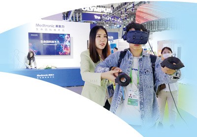 参观者通过虚拟现实技术体验创新医疗技术和疗法。 本报记者 王海林摄 |