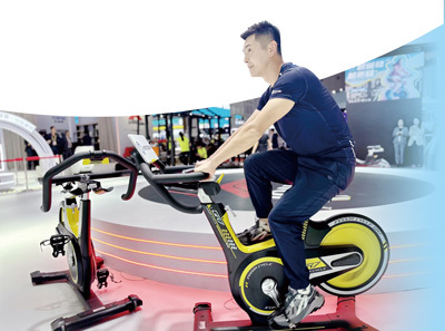 在消费品展区,一家健康科技品牌商正在演示动感单车。 本报记者 王 芳摄 |