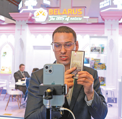 白俄罗斯参展商在进行网络直播。 本报记者 赵益普摄 |