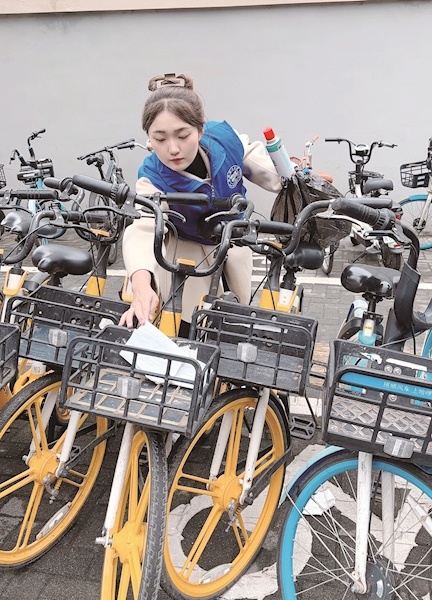 拿起小铲子,他们铲除共享单车上的“牛皮癣”;看到单车乱停在校门口,他们上前重新摆放整齐;当看到同学将共享单车停放在停车线外,他们上前引导规范停放。