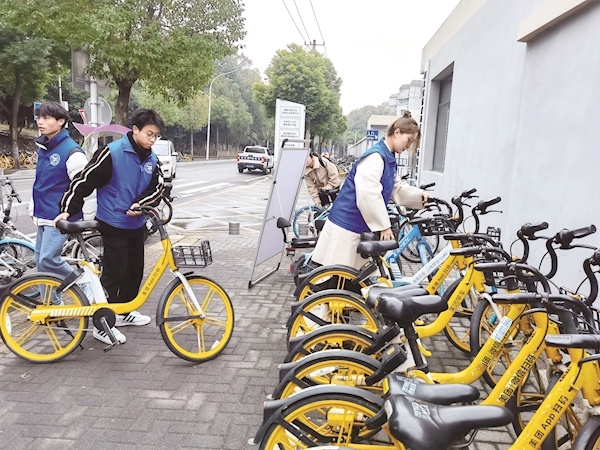 “单车乱停放,占压了盲道,我们一起来将车移到周边的停车框内。”在单车运维人员的引导下,大学生们搬起单车,陆续将单车移走。十几分钟后,20多辆违停单车被摆放得整整齐齐。