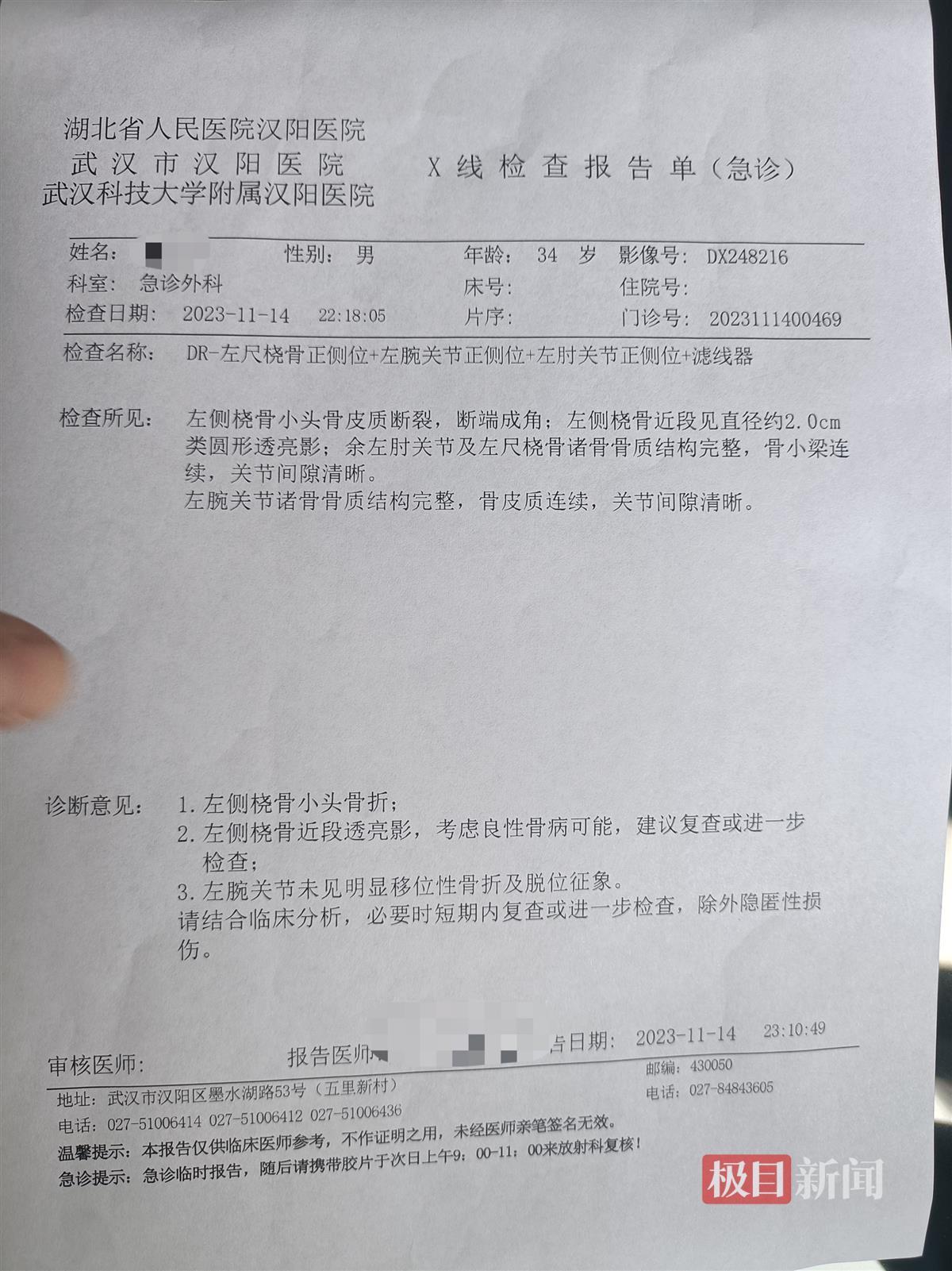 在采访中,王先生向记者展示了自己的诊断结果,结果显示:左桡骨小头骨折。